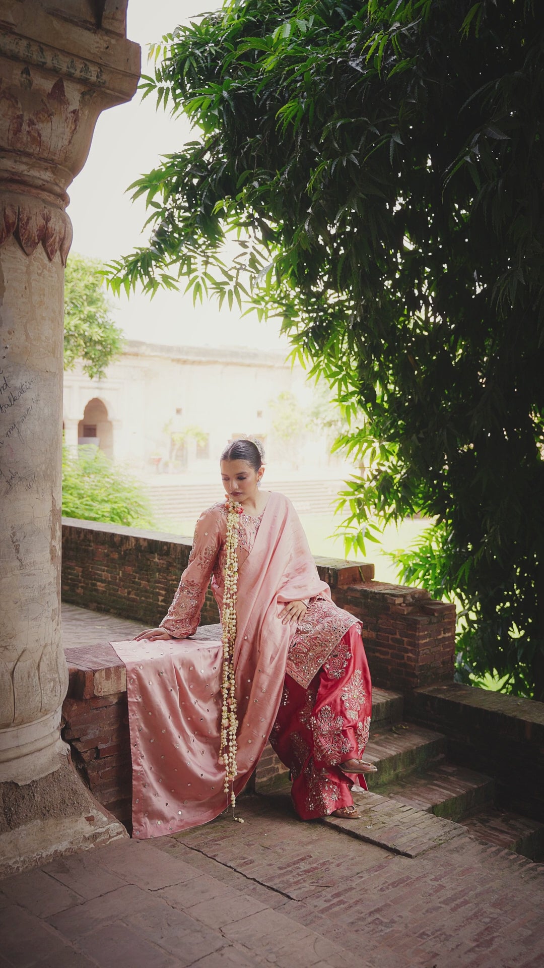 Lalah Gulabi exudes an even more captivating aura of drama and majesty! With *dabka, mirror work, resham, pearls and sequin intricately woven into its design, every movement of the wearer seems to sparkle like a constellation of light! The silhouette sways between elegance and bold tradition, the pink shirt cascading like a river of rose-tinted silk, adorned with hand embroidery that tells a story of craftsmanship and artistry. The coral-red pants beneath are like a burst of fiery passion, heavy with embroidery and mirrors that glint like jewels. The pink dupatta floats like a whisper of elegance, completing this whirlwind of beauty.